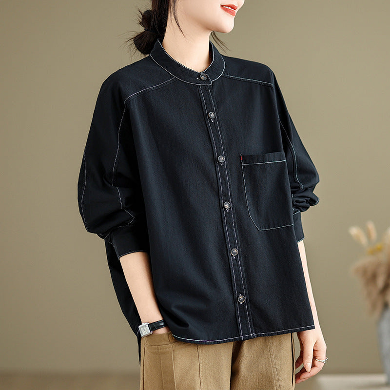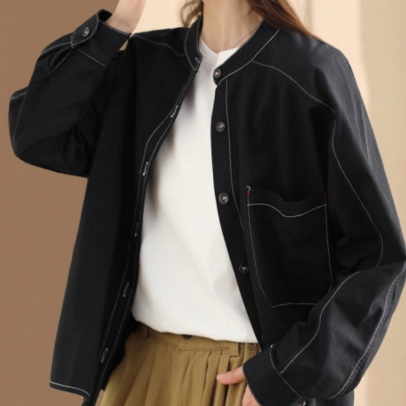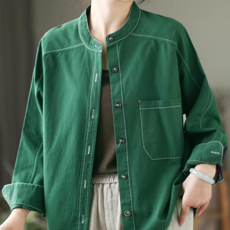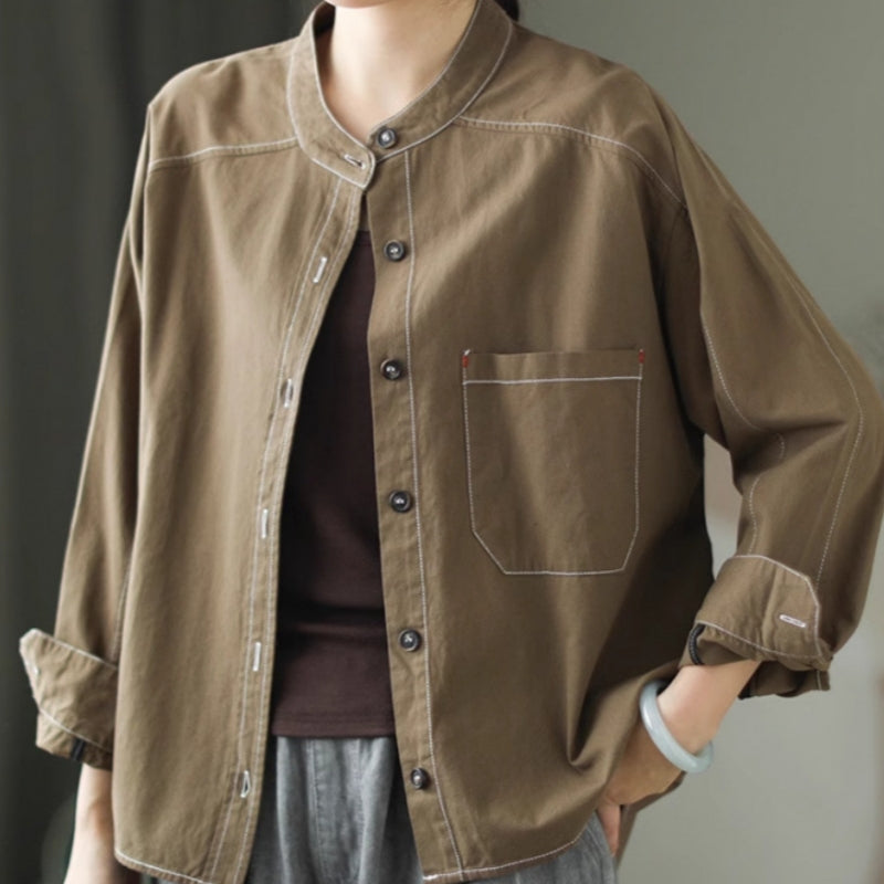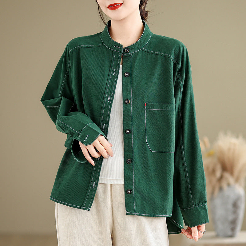 シャツジャケット レディース 長袖 アウター コットン100% 立ち襟 シンプル 無地 レトロ