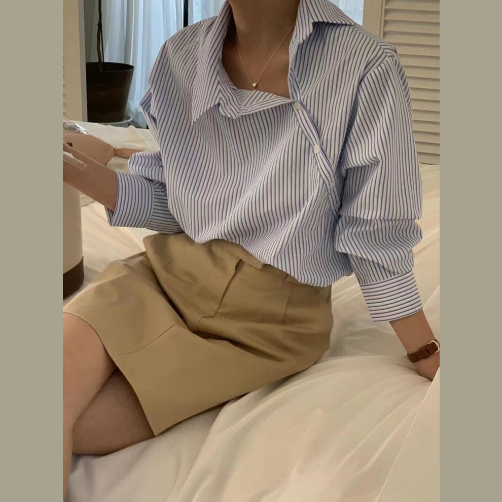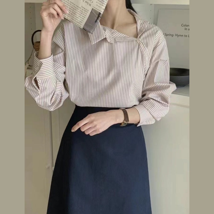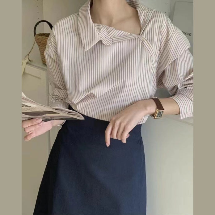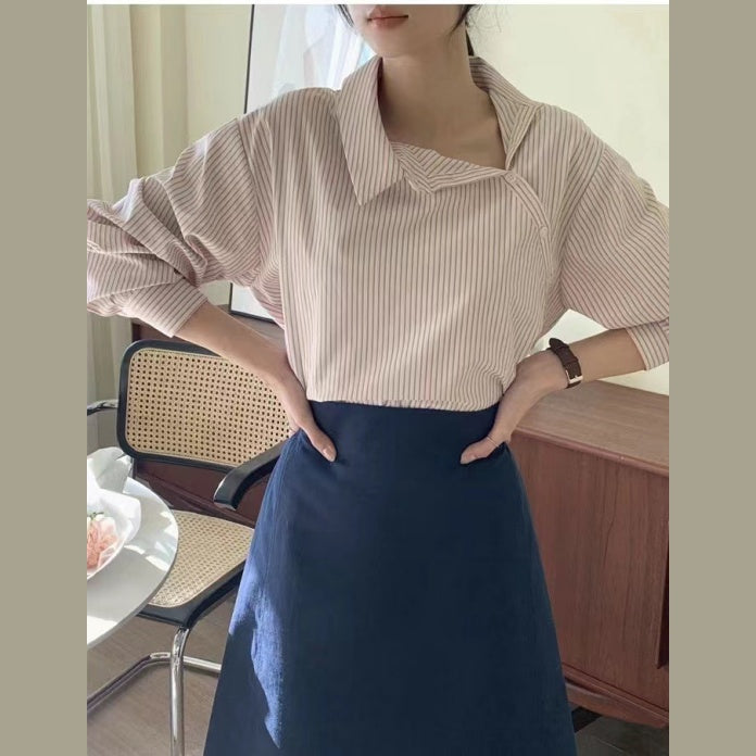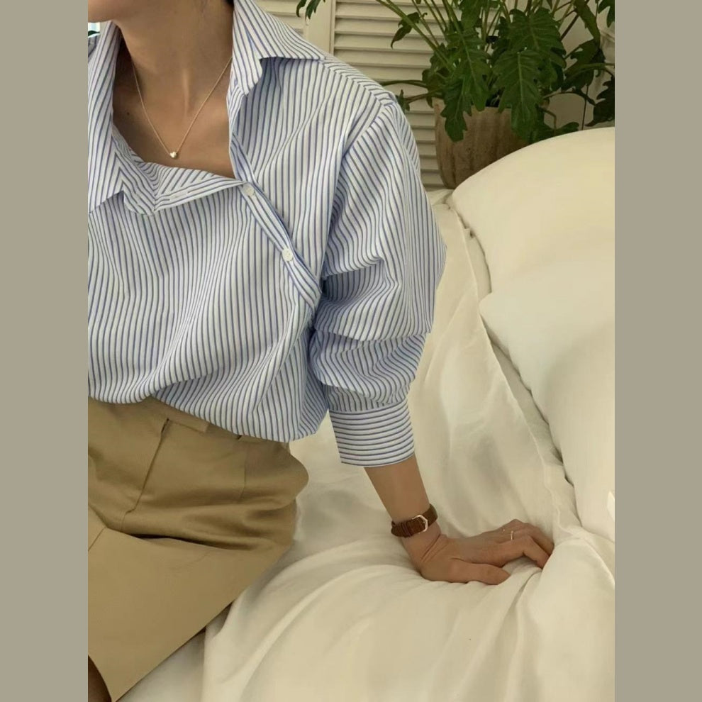 シャツ ブラウス レディース 長袖 ストライプ アシンメトリー 斜めボタン