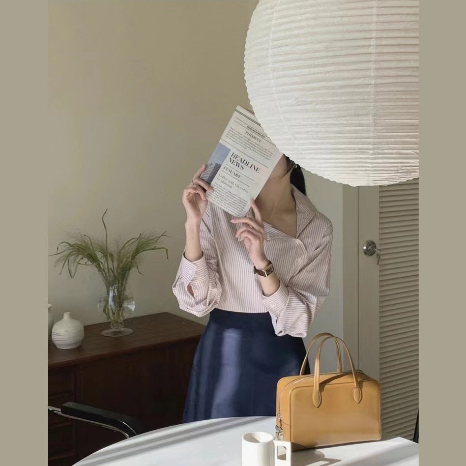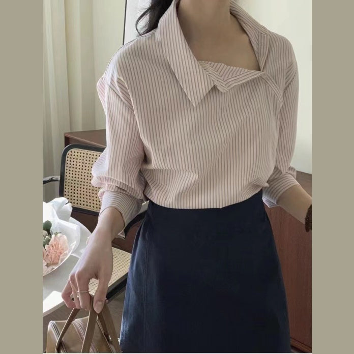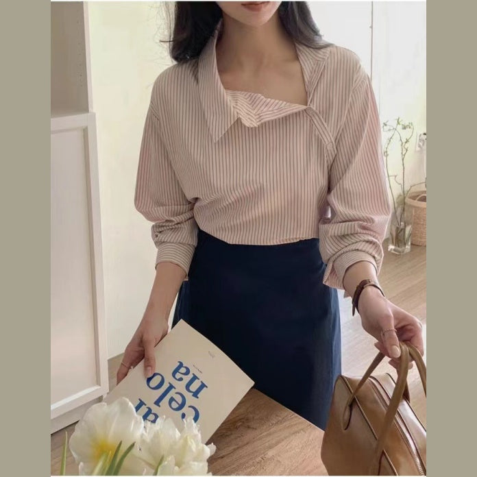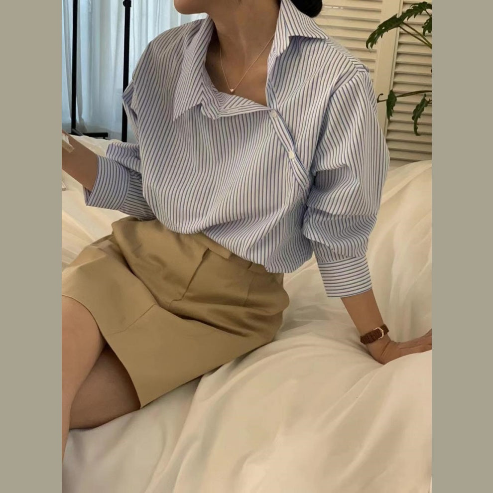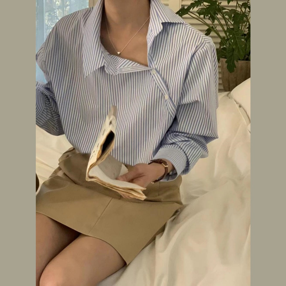 シャツ ブラウス レディース 長袖 ストライプ アシンメトリー 斜めボタン