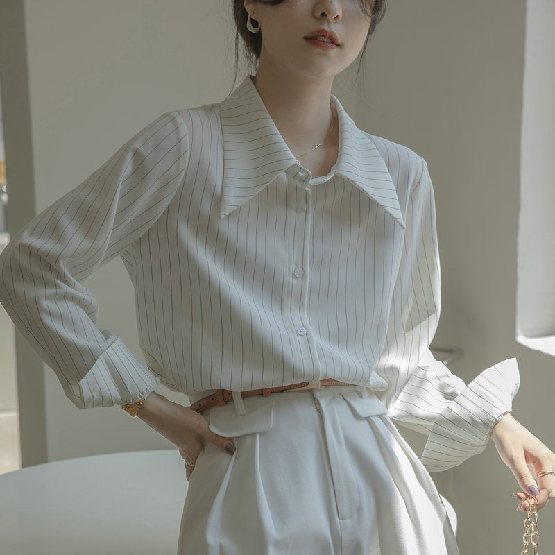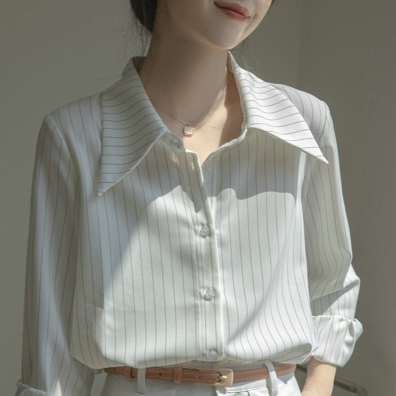 シャツ ブラウス レディース 長袖 ストライプ コットン スタンダードカラー トップス