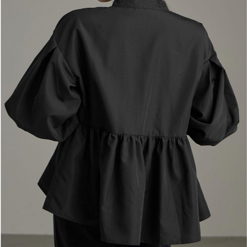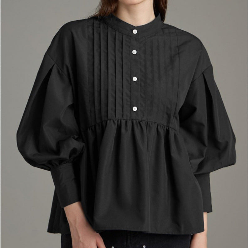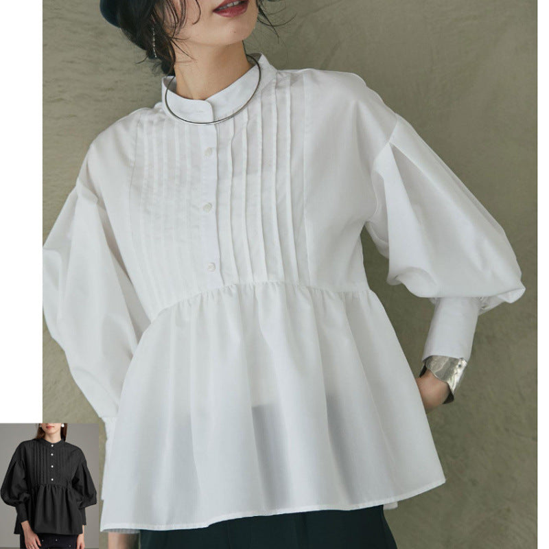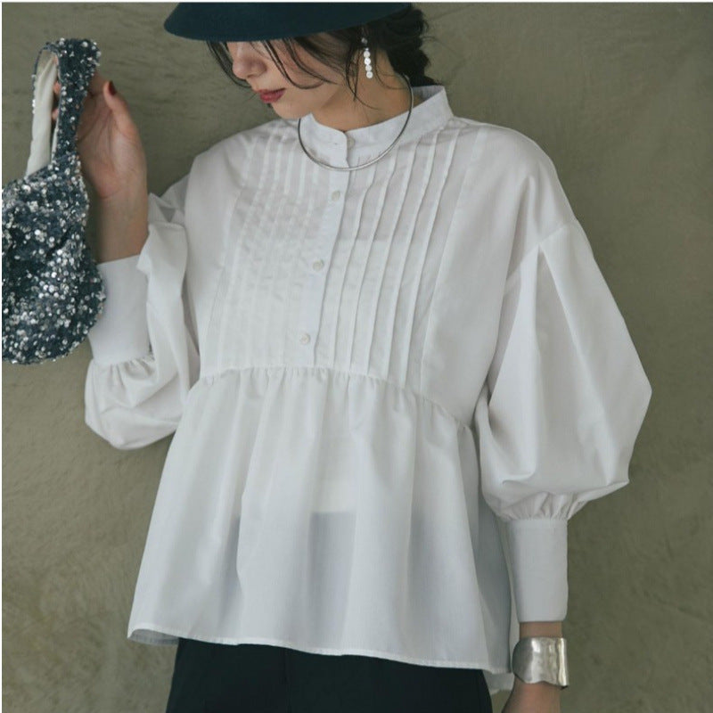 シャツ プリーツ ブラウス レディース 長袖 ストライプ コットン スタンダードカラー