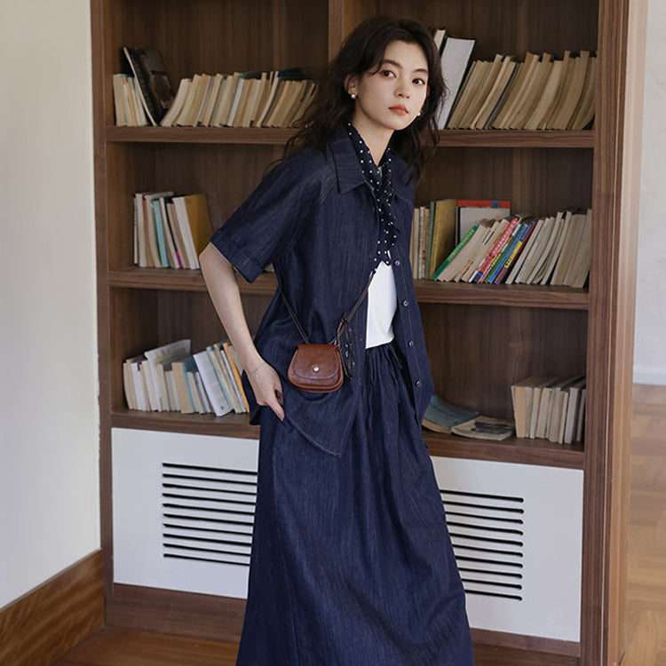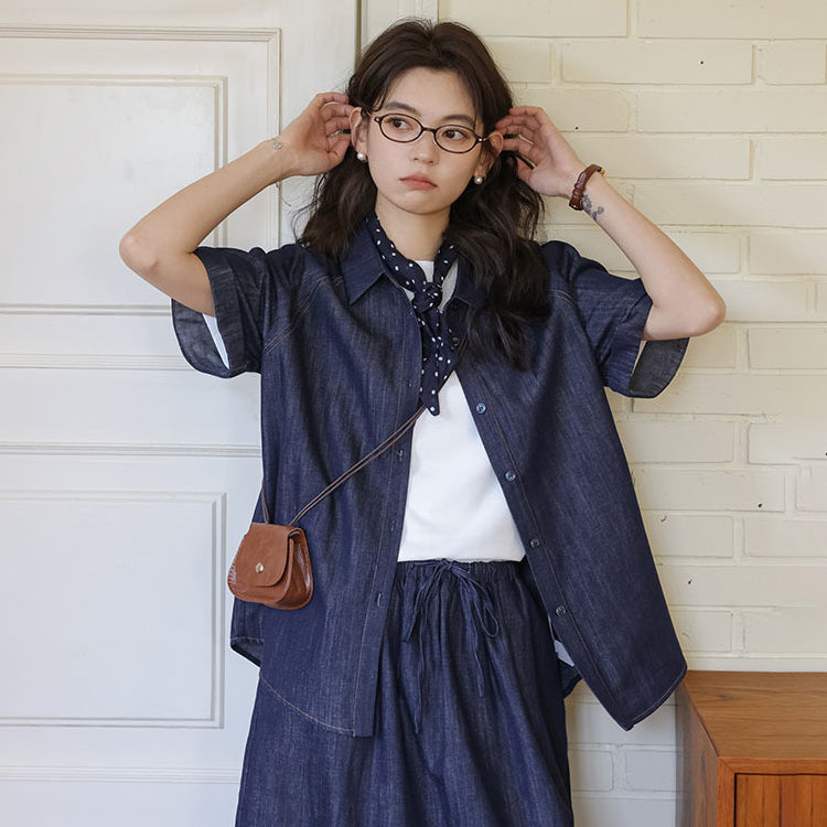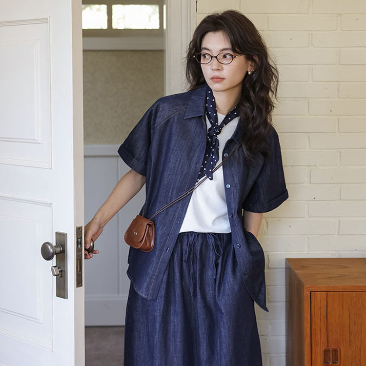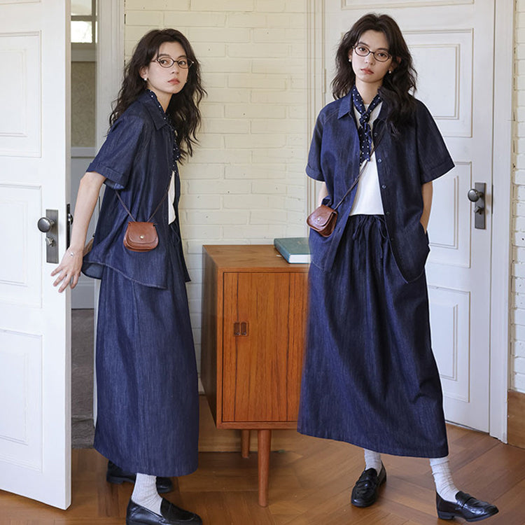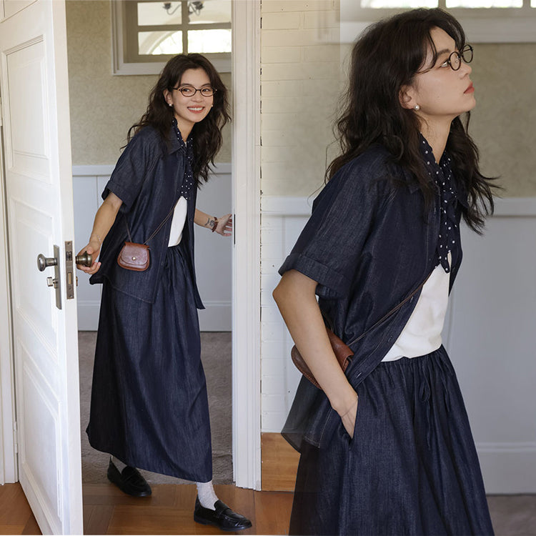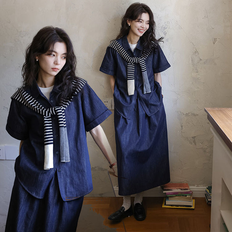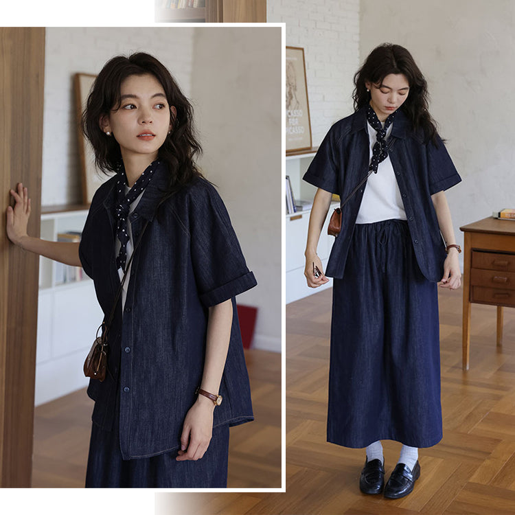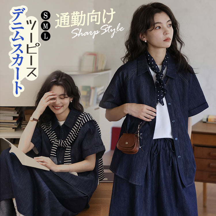 セットアップ レディース デニムシャツ 半袖 トップス デニムスカート 上下セット 夏 秋