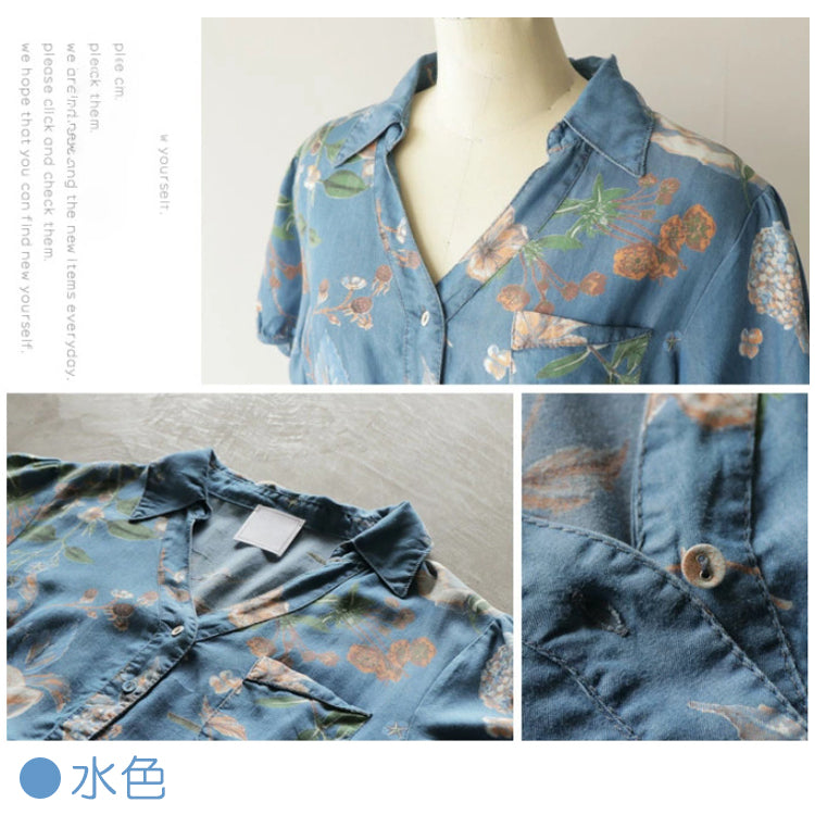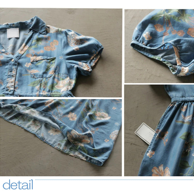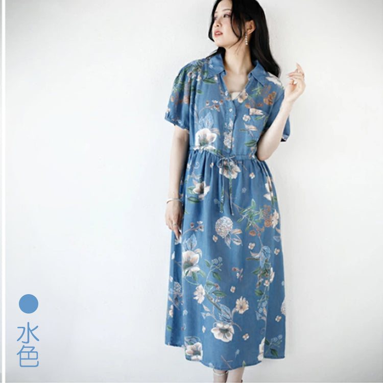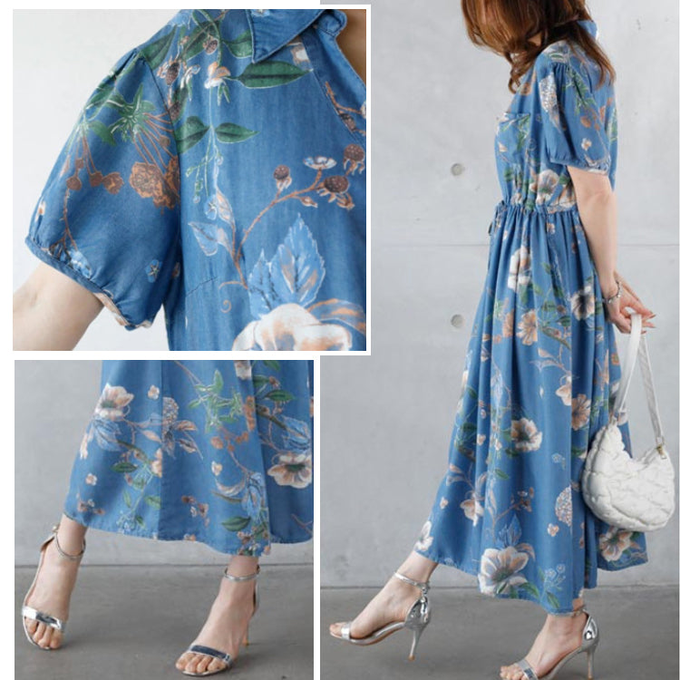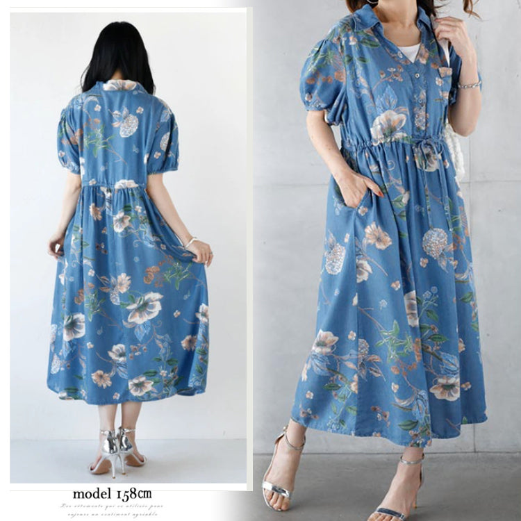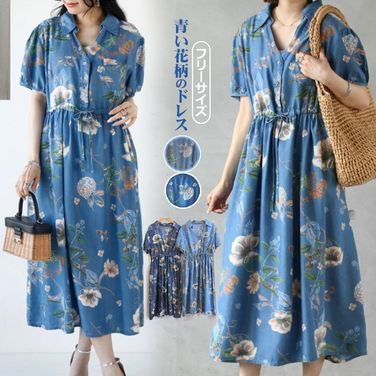 ワンピース 体型カバー ダンガリー ワンピース レディース 半袖 春 夏 秋 花柄