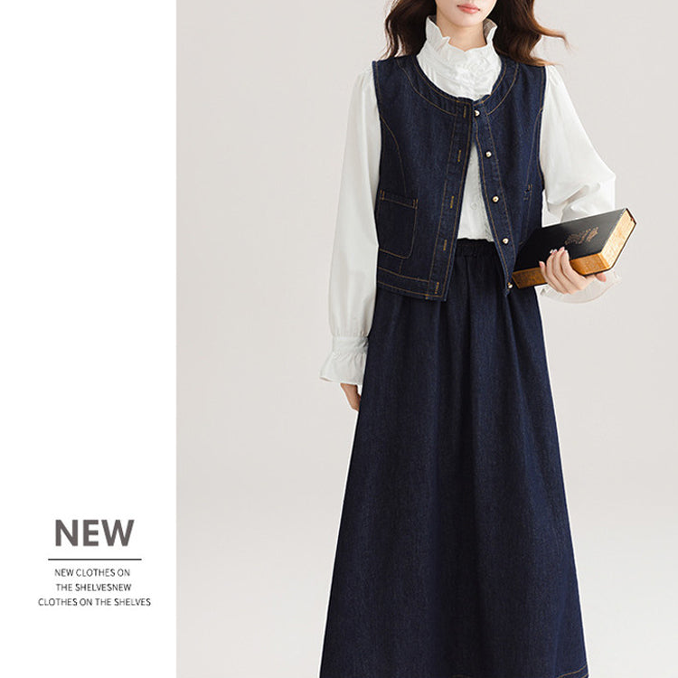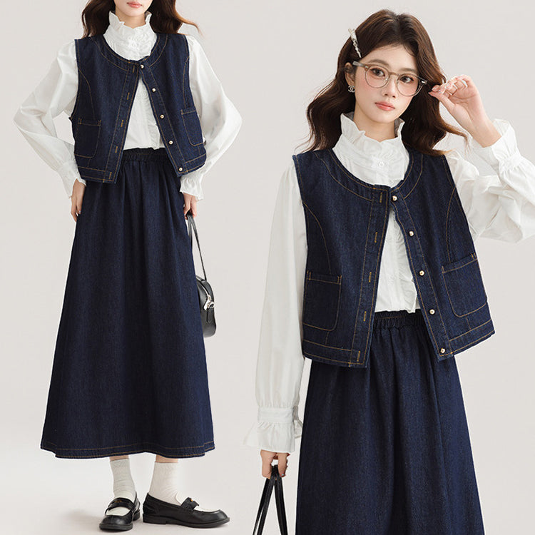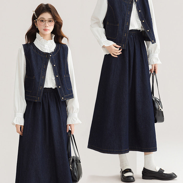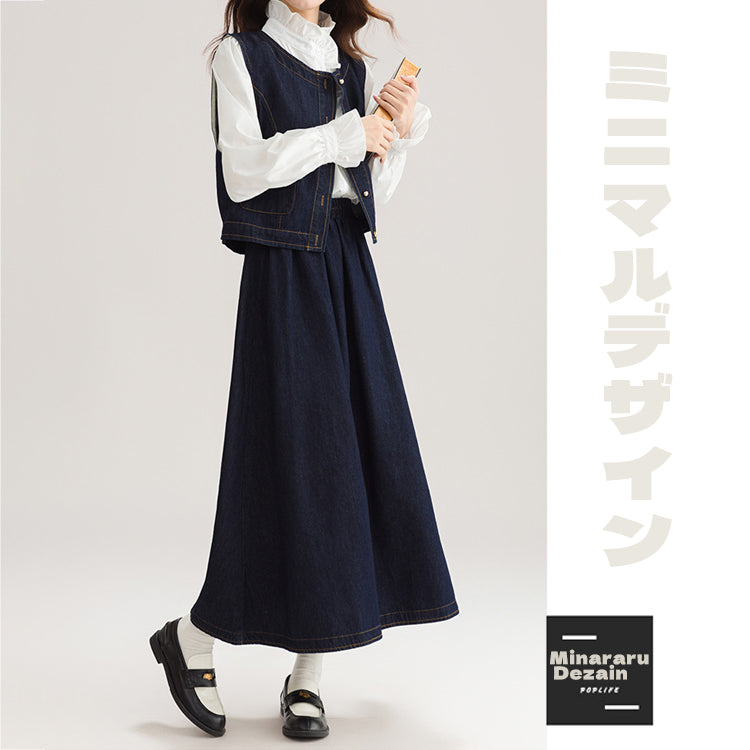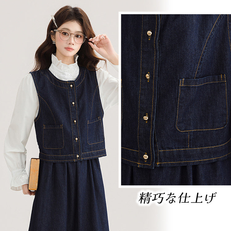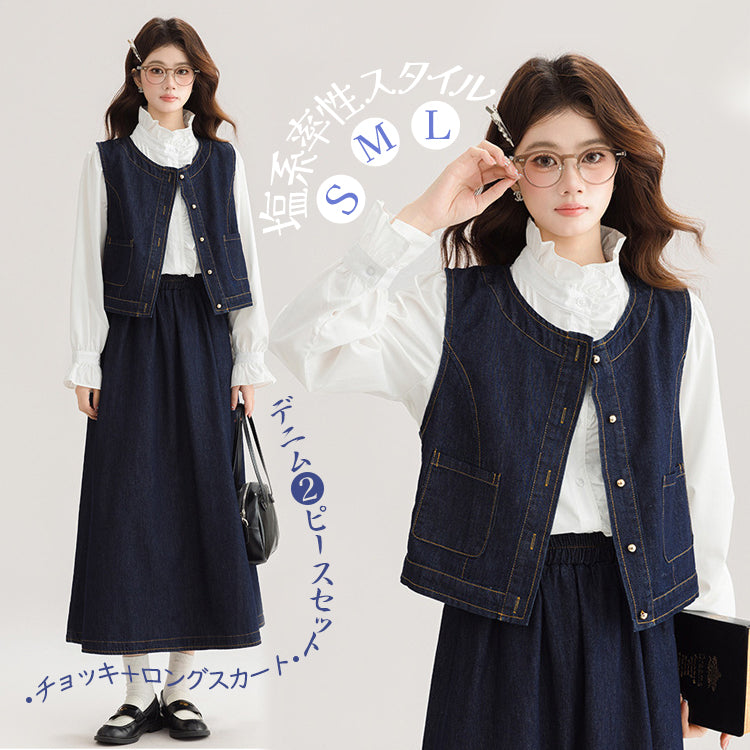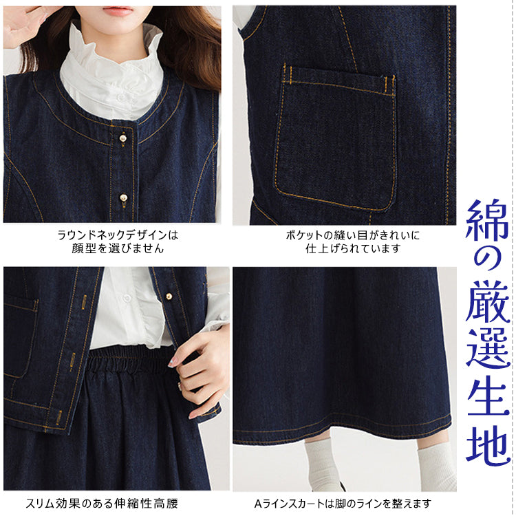 【ベスト+スカート2点】デニムベスト デニムジレ ショート丈ベスト ロング丈スカート