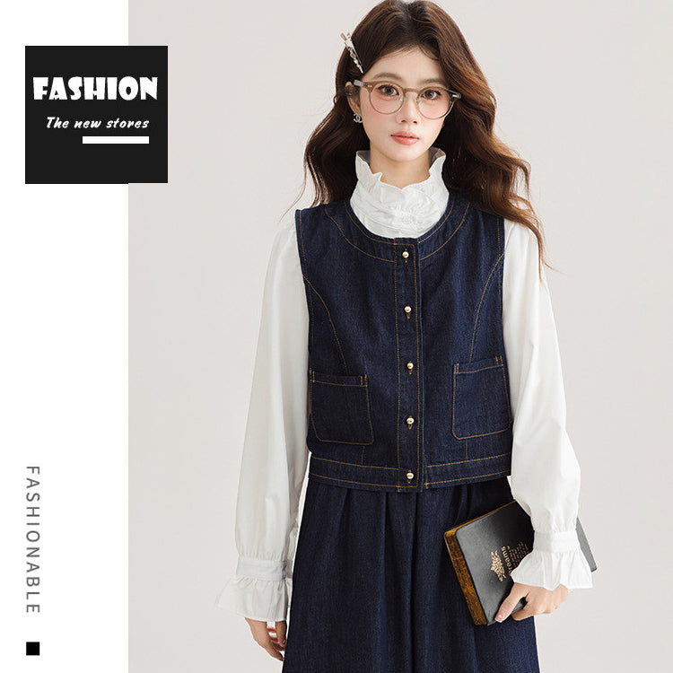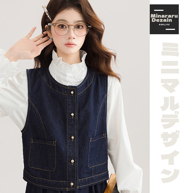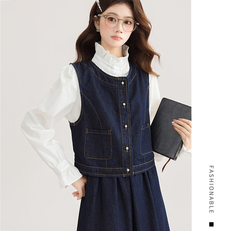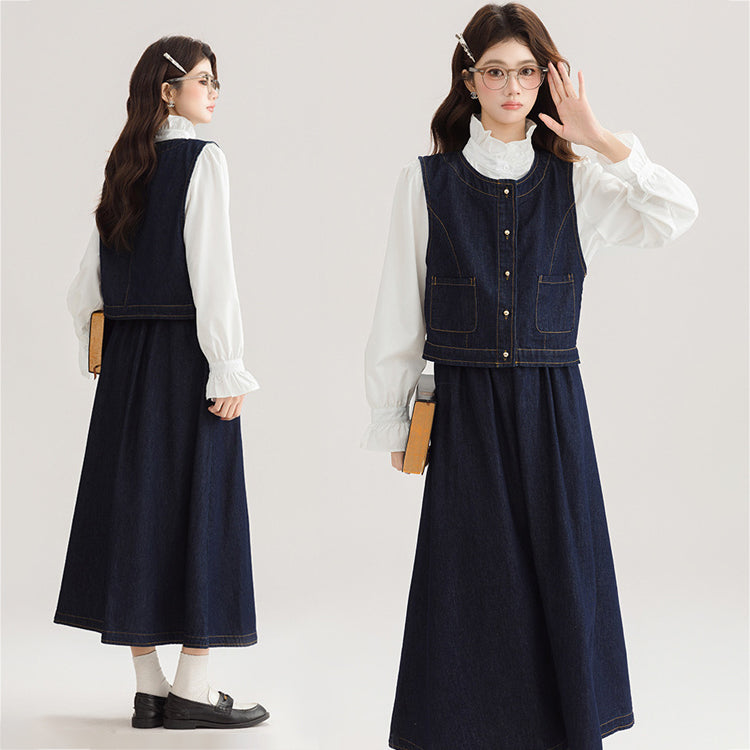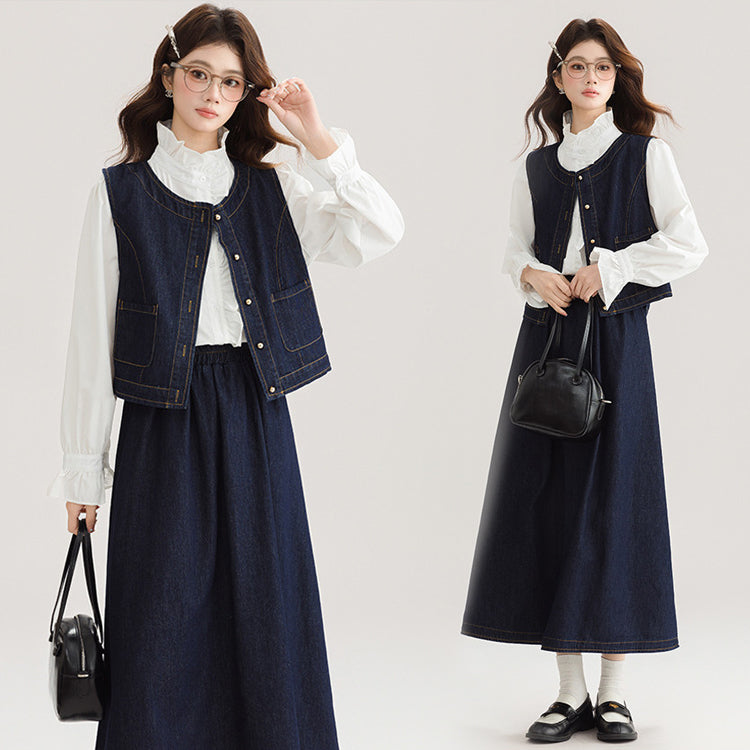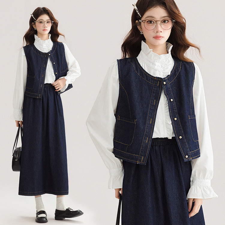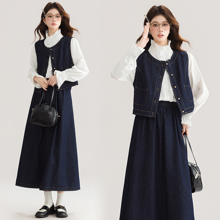 【ベスト+スカート2点】デニムベスト デニムジレ ショート丈ベスト ロング丈スカート