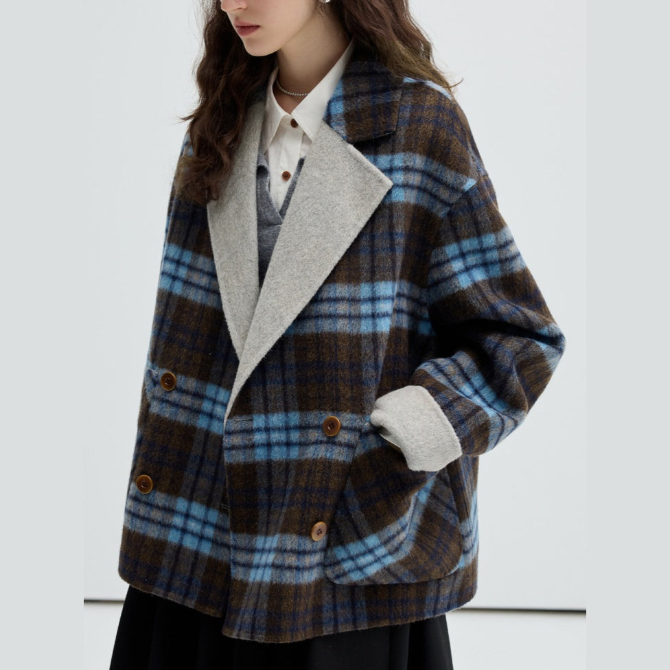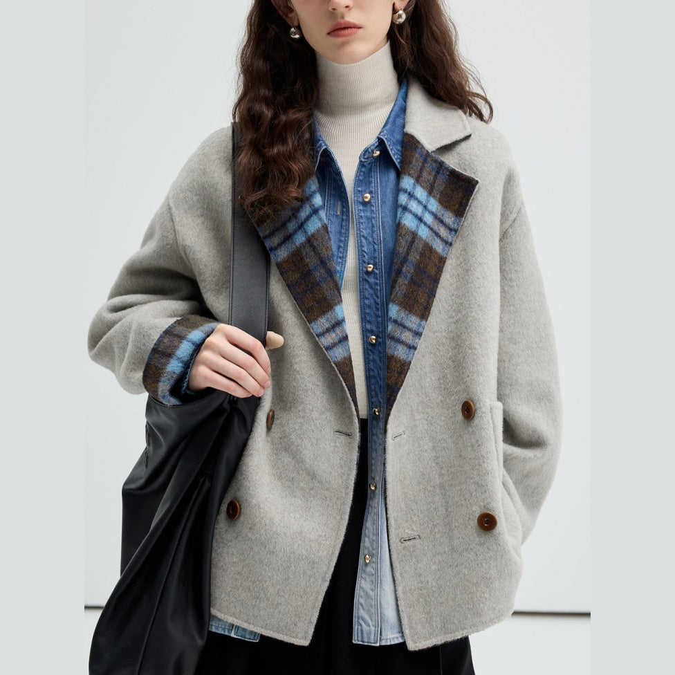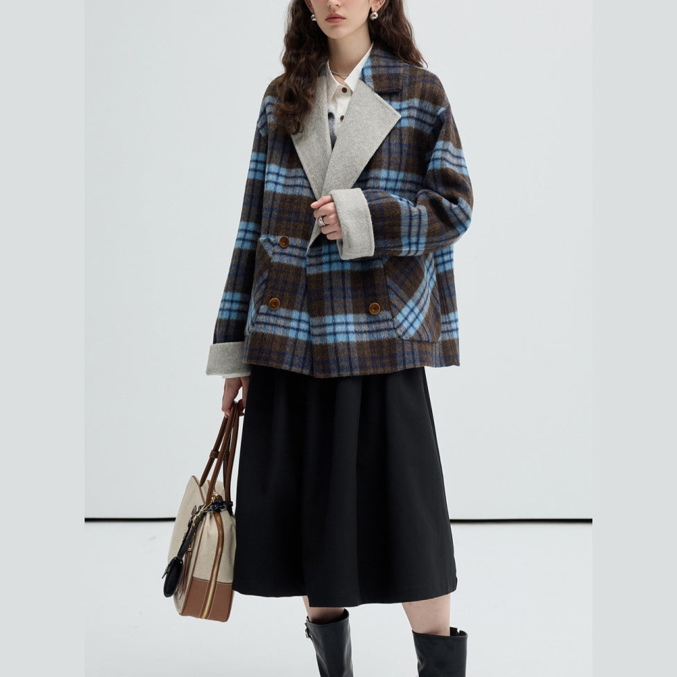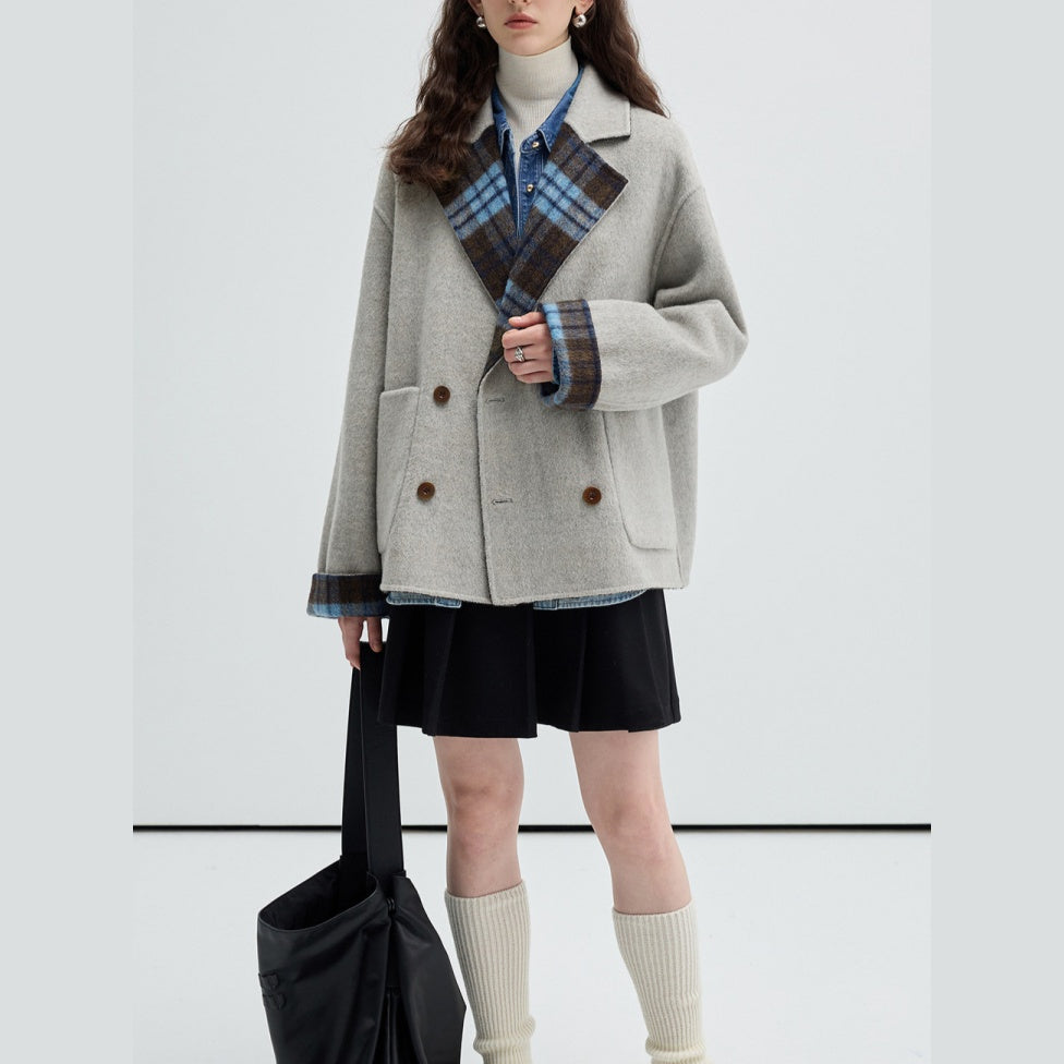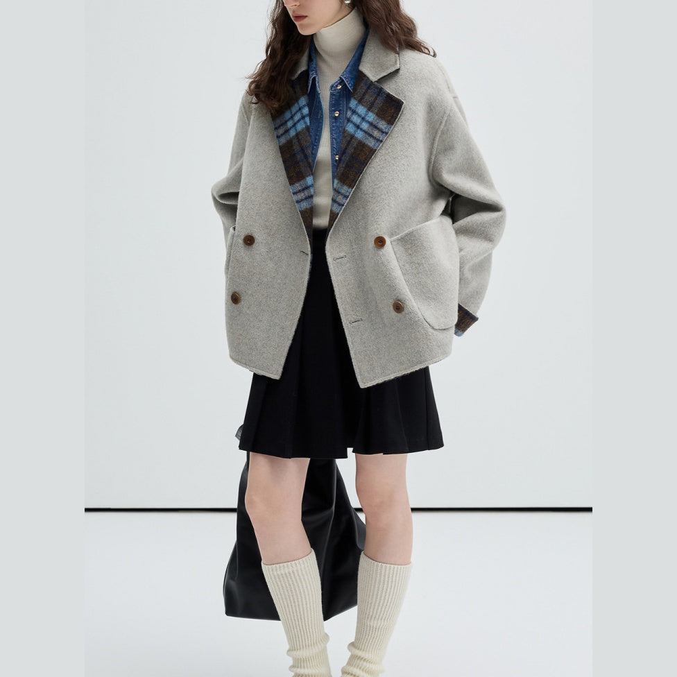 ラシャコート ウール ジャケット 両面着 高級感 コート チェック柄 リバーシブル 立ち襟