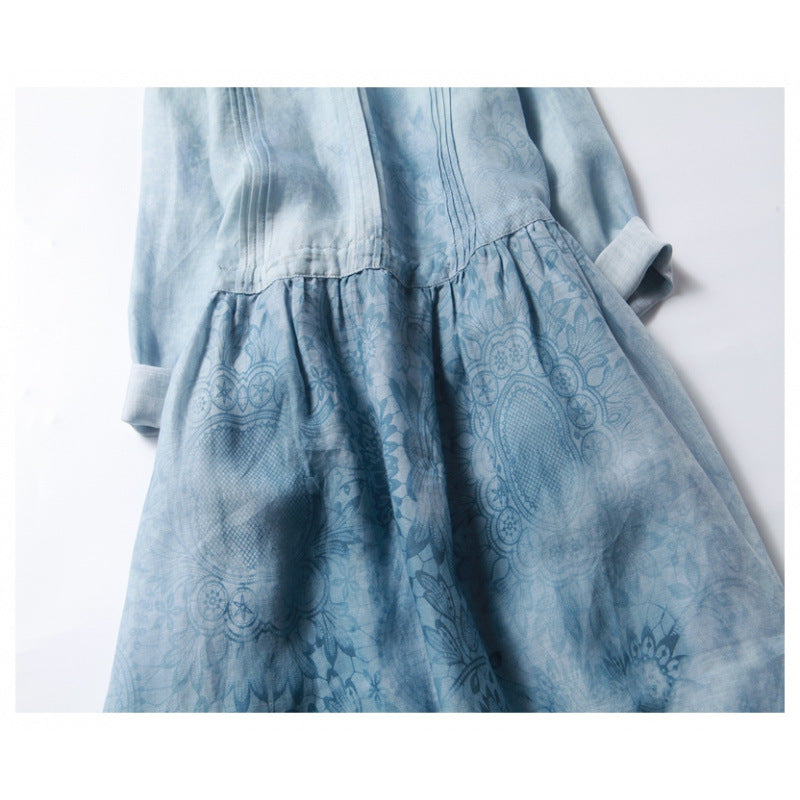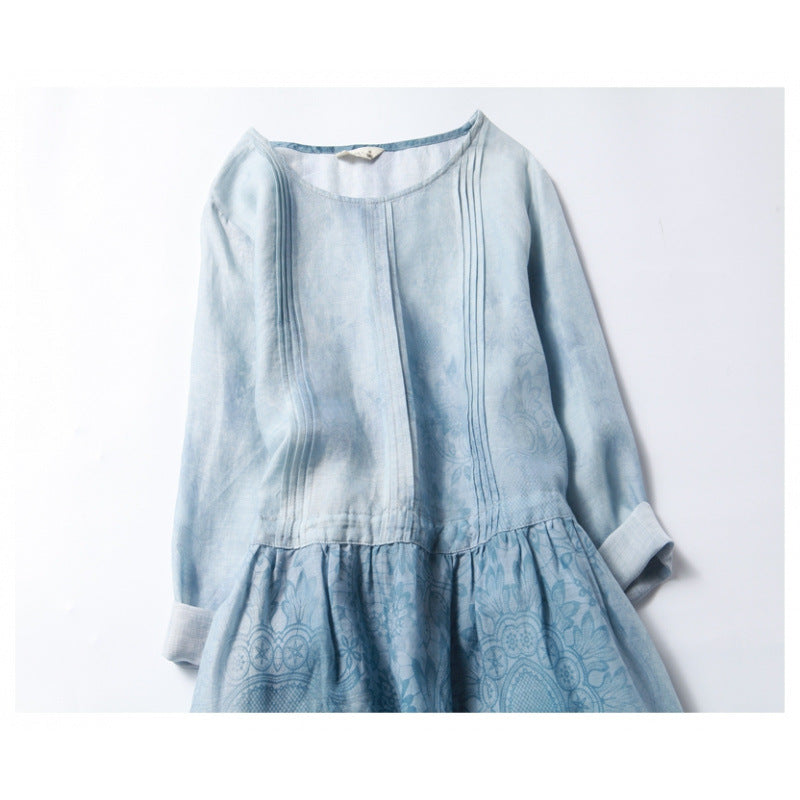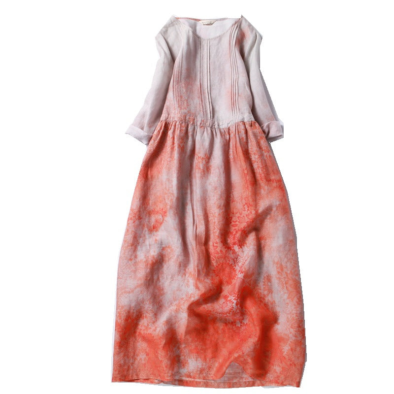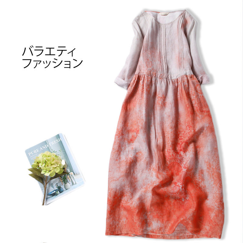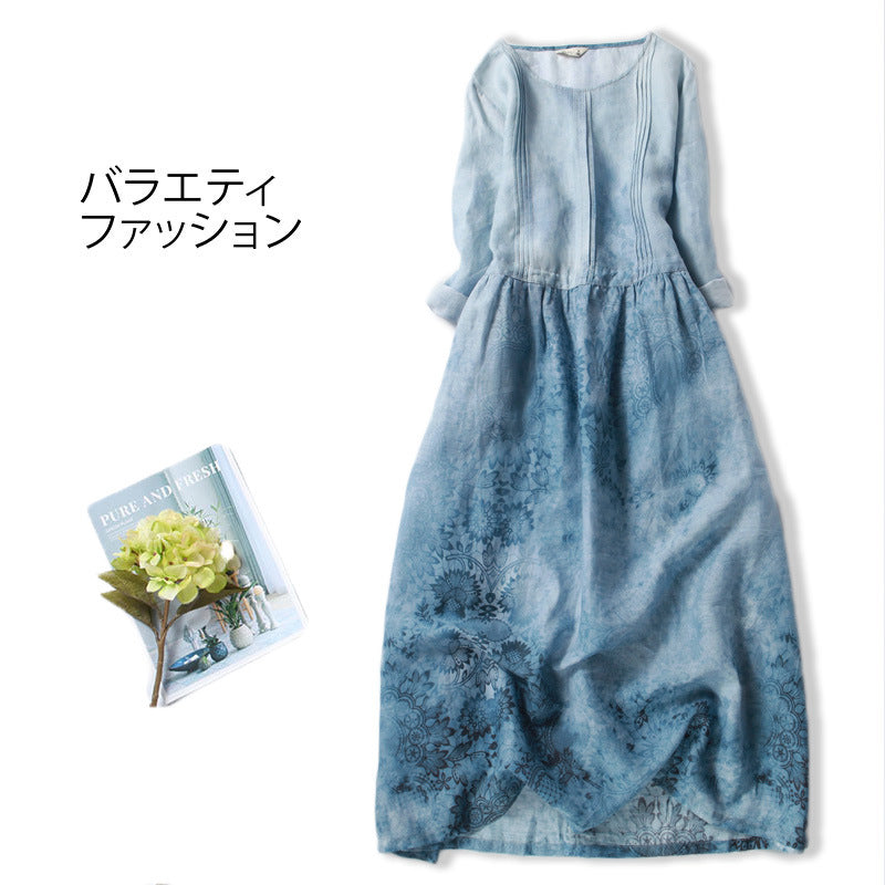リネンワンピース 麻ワンピース 苧麻ワンピース 花柄ワンピース 七分袖
